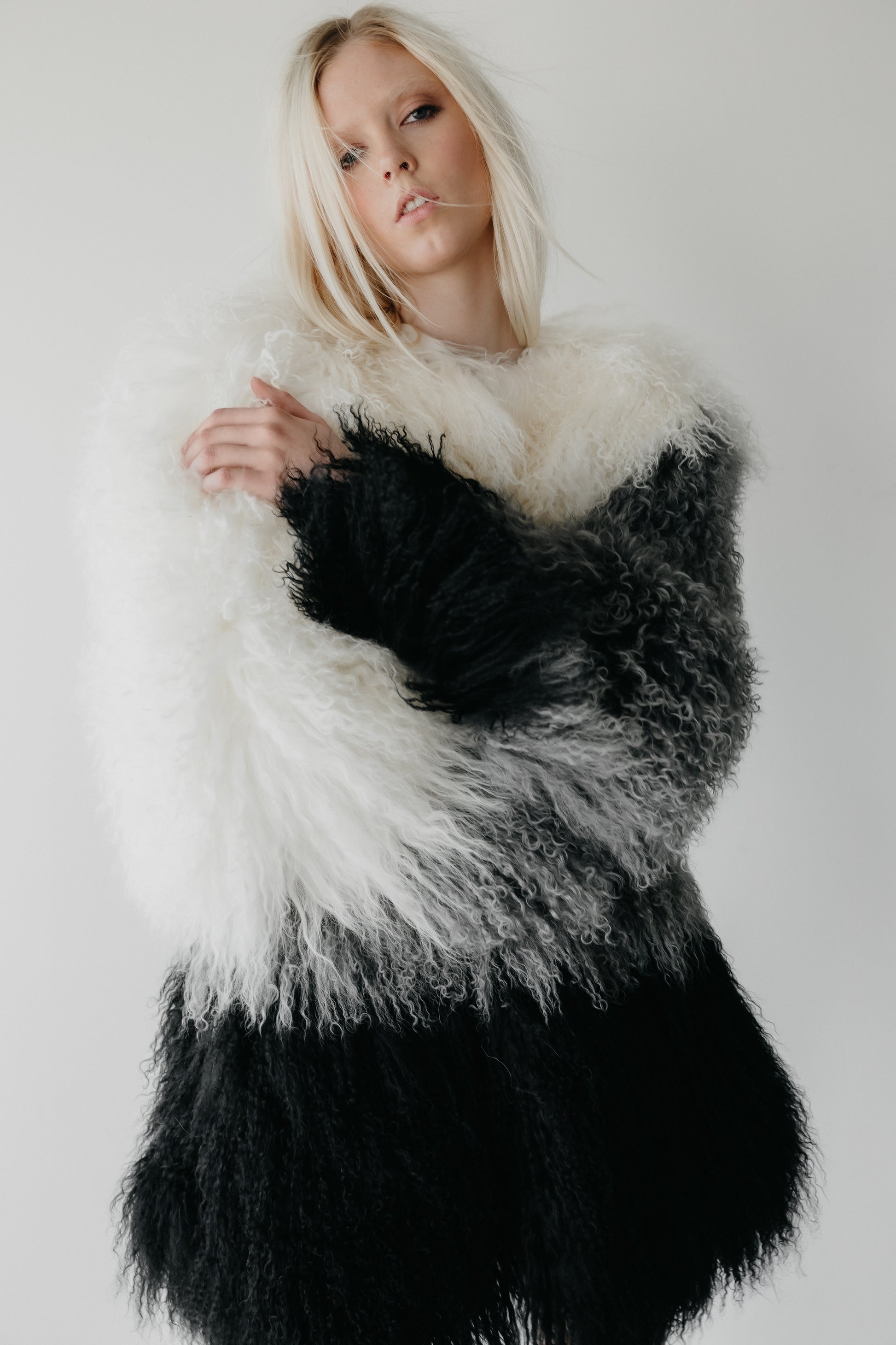 A statement in texture and tone. This jacket features luxuriously soft Mongolian wool with a graded monochrome palette, creating a timeless yet unique piece that stands out effortlessly. Ethically sourced and cruelty-free, no animals are harmed in the making of this product its plush feel and striking design make it as kind as it is unforgettable.