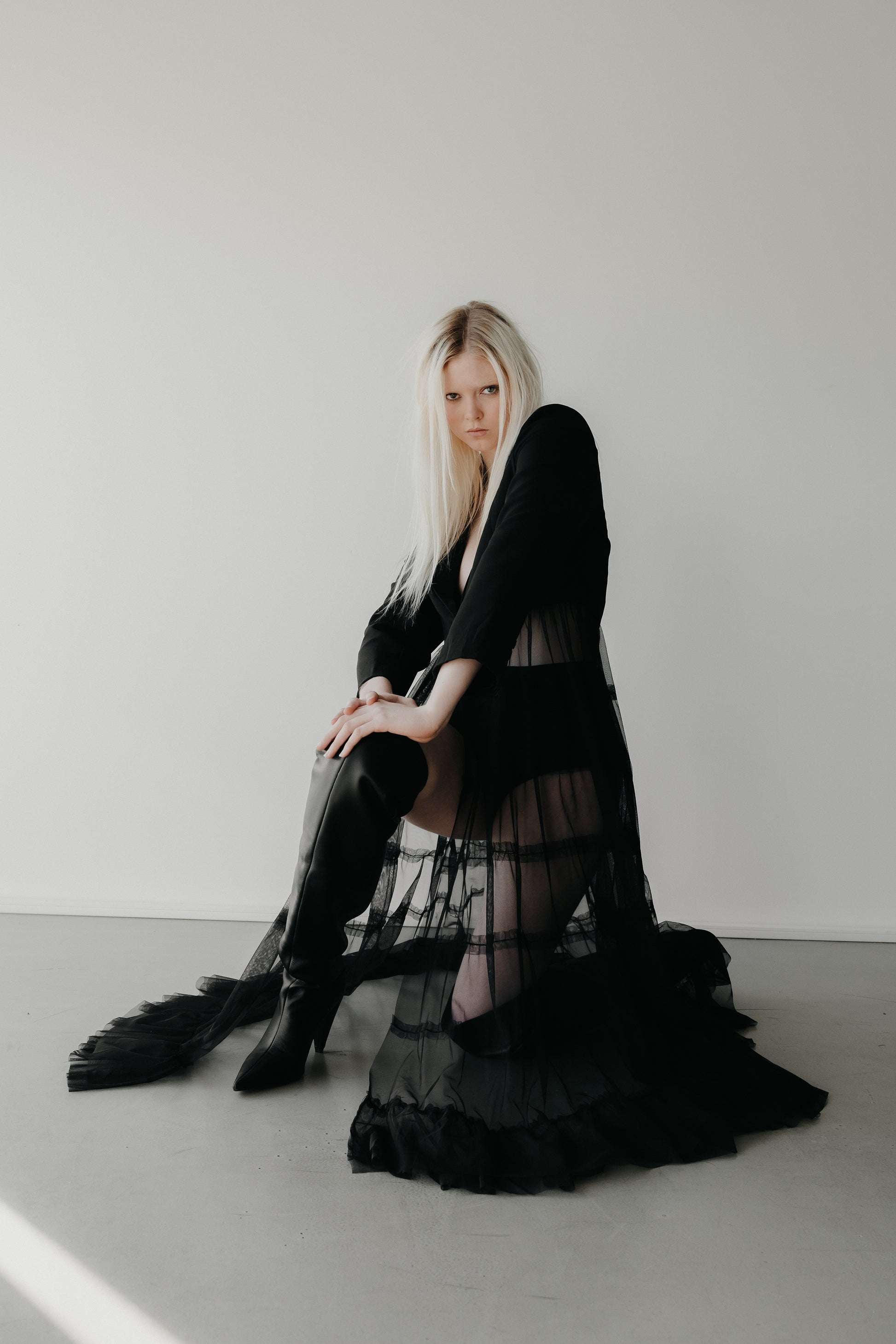 A study in contrast sharp tailoring meets ethereal movement. The structured cropped blazer delivers a sleek, modern edge, while the flowing long mesh skirt brings sheer drama and timeless elegance. Together, they create a look that’s classic yet daring, perfect for making an entrance.